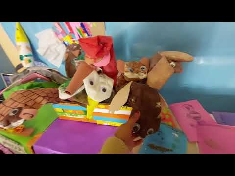 En la entrada de la escuela están todos los trabajos de los chicos que realizaron con las distintas profes.